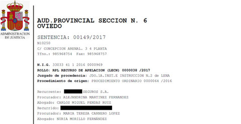 No conforme con la antedicha sentencia, la aseguradora condenada interpone recurso ante la Audiencia Provincial de Asturias. En sentencia de la Audiencia Provincial no solo se confirma íntegramente la sentencia del Juzgado de Lena, sino que condena nuevamente en costas a la aseguradora por dicho recurso. Esta última resolución ha devenido firme.