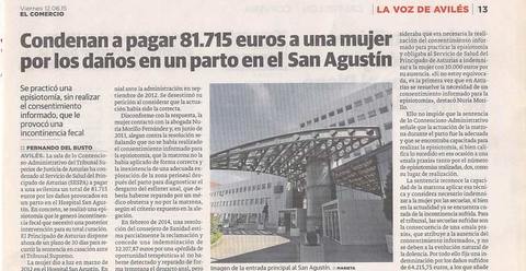 Todo lo anterior es consecuencia de la resolución de un recurso contencioso-administrativo que presentó una avilesina de 32 años a la que le practicaron una episiotomía en el Hospital San Agustín con resultados desastrosos. La mujer, a la que representa la letrada Nuria Morillo Fernández, sufrió debido a esa incisión (que en realidad fueron dos, algo que contraviene la praxis médica convencional) un gran desgarro vaginal y rectal que le afectó seriamente al esfínter anal y le dejó secuelas en forma de incontinencia de gases y heces. La tardanza de un año en reconstruirle la zona perpetuó -aunque atenuadas- esas secuelas y, por eso, el TSJA apreció negligencia médica y condenó a la Consejería de Salud abonar a la recurrente la cantidad de 74.215 euros más 7.500 en intereses devengados desde la fecha de los hechos. Previa a la acción contencioso-administrativa, la mujer había reclamado por la vía administrativa, pero sin éxito pues tanto la aseguradora como la Consejería desestimaron su queja.