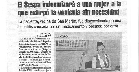 [Leer Más]Sotrondio, Luisma DÍAZ. La Sala de lo Contencioso-Administrativo del Tribunal Superior de Justicia de Asturias (TSJA) ha condenado al Servicio de Salud del Principado de Asturias (SESPA) a pagarle 19.256 euros, además de los intereses, a una vecina de San Martín del Rey Aurelio a la que se le extirpó, “sin causa que lo justificara”, la vesícula biliar en el Hospital Valle del Nalón.