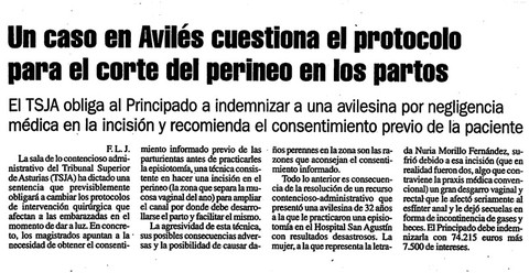 Aunque la respuesta atendía parcialmente a sus peticiones, la mujer solicitó a la letrada Nuria Murillo que presentase un nuevo recurso, en este caso ante el Tribunal Superior de Justicia de Asturias y que el pasado 8 de junio estimaba la mayor parte de sus argumentos. Así, consideraba que era necesaria la realización del consentimiento informado para practicar la episiotomía y obligaba al Servicio de Salud del Principado de Asturias a indemnizar a la mujer con 10.000 euros por su ausencia. «Si no estoy equivocada, es la primera vez que en Asturias se resuelve la necesidad de un consentimiento informado para la episiotomía», destacó Nuria Morillo.