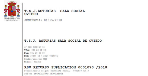 El Instituto Nacional de la Seguridad Social ha sido obligado por sentencia del Tribunal superior de justicia de Asturias a reconocer una incapacidad permanente en grado total cualificada