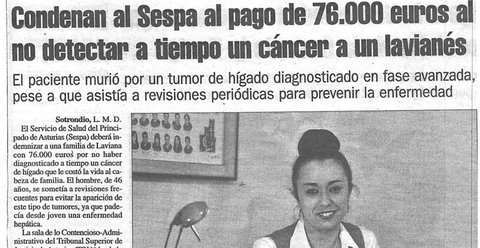 [Leer Más]Sotrondio, L. M. D. El Servicio de Salud del Principado de Asturias (SESPA) deberá indemnizar a una familia de Laviana con 76.000 euros por no haber diagnosticado a tiempo un cáncer de hígado que le costó la vida al cabeza de familia. El hombre, de 46 años, se sometía a revisiones frecuentes para evitar la aparición de este tipo de tumores, ya que padecía desde joven una enfermedad hepática.